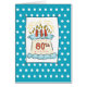 Torne possível um aniversário encantador. Comemore com alguém no 80 aniversário com este cartão. Aqui está um bolo de aniversário sobre um fundo branco e azul pontilhado, iluminado com 80 velas.