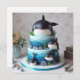 BOLO DE CAMADA DE ANIVERSÁRIO DE CRIANÇA DE BALEIA BRANCA E PRETA, NA FRENTE DA PLACA. CÓPIA COMPLETAMENTE EDITÁVEL NA PARTE TRASEIRA.