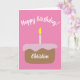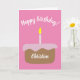 Mande seus desejos para a aniversariante com um cartão de aniversário ilustrado e bonito com um bolo de fosco rosa com uma vela acesa com solteiro. As palavras "Feliz aniversário!" acima do bolo podem ser personalizadas para outra mensagem de saudação. O nome personalizado no bolo, é claro, pode ser mudado para personalizar a aniversariante. No dentro, o fundo do lado esquerdo é da mesma cor da frente. O lado direito contém a mensagem padrão em uma fonte correspondente ou sua mensagem pessoal. Cartão bonito para raparigas e mulheres de todas as idades.
