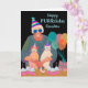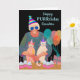 Feliz aniversário PURR, cartão de cumprimentos de papel com uma ilustração colorida de festa de aniversário de gato com uma senhora e dois gatos em modo de festa. Os gatos estão usando chapéus de festa, assim como a senhora que também usa óculos de sol azuis escuros. Uma fileira de bolos com velas de aniversário está na mesa. Balões e um presente também fazem parte do design. Arte, imagem e verso copyright © Shoaff Ballanger Studios, 2023.