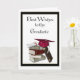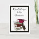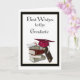 Cartão de formando de felicitações. boné vermelho e diploma em pilhas de livros.