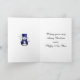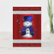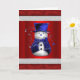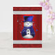 Um boneco de neve azul fofo, vestido com colete de veludo azul e chapéu de coco, com estrelas e laços ao seu redor, em um fundo vermelho metálico. Ele é emoldurado por veludo vermelho (apenas impresso) e pelo de terno de Natal branco de Papai Noel. A mensagem interna diz "Desejando a você um muito feliz Natal e um feliz Ano Novo" pode ser personalizada.