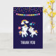 Cartões de agradecimentos com 2 unicórnios dançantes bonitos com caudas brilhantes e coloridas, e mano. Um arco-íris colorido com nuvens em cada lado acima de suas cabeças. Outros elementos incluem uma pequena flor, um coração e algumas estrelas. Fundo roxo escuro. Pontos de confete coloridos e uma imagem de banner de bunting ao longo do topo.