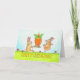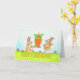 Peça este belo cartão para desejar um Feliz Aniversário a alguém. No centro deste cartão, dois coelhos se juntaram, o da esquerda está sorrindo e segurando um prato de servir ao da direita. Nele está um bolo de aniversário. Uma enorme cenoura laranja está a sair dela. Ela tem uma vela vermelha e solteiro acesa saindo do meio de suas folhas. O segundo coelho está tão alegre pela visão, ele pula no ar, espalhando seus pequenos braços e rindo. Ele está vestindo um chapéu colorido. Os coelhos estão em frente a um fundo azul claro, sobre uma erva verde-clara, na qual as palavras "Parabéns" são escritas manualmente em letras amarelas.