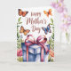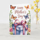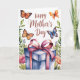 Este design é completo com uma ilustração em aquarela de borboletas, folhagens, flores e um presente. As palavras "Feliz Dia das Mães" também aparecem na frente do cartão. Dentro do cartão está escrito: "Mãe, você é minha borboleta—graciosa, forte e cheia de amor". Você pode substituir isso por sua própria mensagem, se desejar. Aproveite!