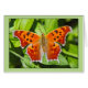 Uma borboleta de vírgula laranja vívida foi fotografada enquanto assentava na folhagem verde-clara.