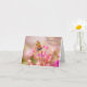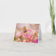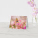 Uma pequena borboleta de cobre com asas alaranjadas e pretas manchadas repousa delicadamente sobre flores cor-de-rosa brilhantes. O fundo com foco suave adiciona uma qualidade sonhadora à cena, realçando a beleza natural e a tranquilidade. Este cartão de cumprimentos dobrado “Pensando Em Você” pode ser personalizado se desejar. Ele está em branco por dentro para que você escreva sua própria mensagem pessoal.