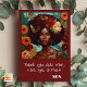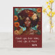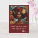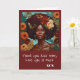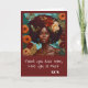 Cartão de dia das mães único com a face de uma linda mulher em fundo marrom. Ela tem flores laranja no seu cabelo afro e brincos boho. Na frente, você pode ver o espaço de texto onde você pode editar seus próprios nomes ou texto de sua preferência .."Te amo, etc..) Isso você pode editar facilmente.