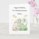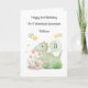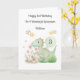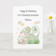 This birthday card is suitable for a grandson or son's first, 2nd or 3rd birthday. The design includes the number 3 (which can be changed or removed), birthday stars, watercolour grass, flowers and rocks, and a grey-green orange dinosaur with balloon.