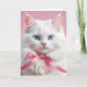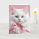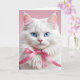 Bonito gato branco com olhos azuis e arco cor-de-rosa em fundo rosa para o aniversário. O texto é editável.