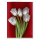 Tulipas macias, brancas em um fundo do tecido vermelho brilhante.