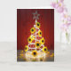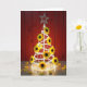 The card shows a unique and pretty picture of a glowing Christmas tree made of twinkling white fairy lights. It has yellow sunflowers with dark centers on it and a shiny silver star on top. The background is a bold, deep red color that makes the tree stand out. There are also some yellow flower petals scattered around it. The whole scene looks elegant and festive, with a warm, inviting glow. It's a perfect card to send holiday cheer 🎅🏼🎄🎁!