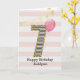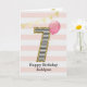 Cartão de aniversário de 7 anos dourado e rosa para meninas, que você pode personalizar com o nome dela. A frente deste lindo cartão de aniversário de 6 anos para ela apresenta o número sete em uma faixa preta e branca com um contorno de brilho com um balão rosa pronto para flutuar. Por favor, note que o brilho é um efeito de design e nenhum brilho real estará neste cartão de aniversário. O fundo é um branco e rosa suave com uma faixa de bandeirolas douradas no topo. A mensagem interna pode ser facilmente personalizada se desejar. Um cartão de aniversário de 7 anos único para neta, filha, sobrinha, etc.