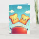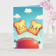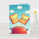 Duas fatias animadas de desenho animado de pão com rostos sorridentes estão saindo de uma torradeira vermelha cercada por migalhas voadoras contra um céu azul brilhante por um aniversário. Todo o texto pode ser alterado.