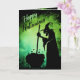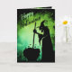 Carta de Feliz Dia das Bruxas divertida, com uma bruxa silenciada, agitando um caldeirão contra um fundo verde. Dentro de texto personalizável "Melhores feiticeiros de".