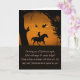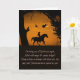 Um cartão de cavalo e cavaleiro na noite de Halloween. Uma bruxa e seus familiares, um gato preto, coruja e coruja, carvalho e lua crescente e um poema divertido para o Halloween. Deseje a alguém um Halloween extraordinário, incrível, único, excepcional, especial, divertido e notável!