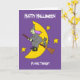 Desenho de uma velha bruxa assustadora com nariz verdeado e cabelo roxo voando pela vassoura sobre a lua acompanhada por seu gato. A mensagem diz Feliz Dia das Bruxas e Voando Hoje à noite e há um animado dentro de aranha bonitinho no cartão. Personalize facilmente este cartão editando as caixas de texto modelo - obrigado para ver os meus cartões de Dia das Bruxas. Não tenha medo agora.