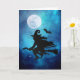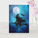 Silhueta de bruxa voadora com um morcego preto . A lua cheia brilha intensamente em um belo céu estrelado sombreado de azul . Dentro do cartão - Morcego assustador voando em um belo céu estrelado sombreado de azul . Personalize com sua própria mensagem ou exclua o texto se desejar deixá-lo em branco (para mensagem manuscrita)