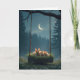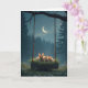 Três coelhos se juntam num balanço coberto de grama pendurado em um galho de árvore colocado contra um misterioso pano de fundo da floresta com uma lua crescente iluminando o céu. Todo o texto pode ser alterado.