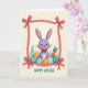 This greeting card features a pastel lavender 🐰 with a small smile, rosy cheeks, and a neat scarlet bow tie, standing as the sweet focal point of the scene. Around it sit decorated eggs in teal, sky blue, and warm orange, with stripes, dots, and light textures that feel like little gifts arranged for someone special. A plump orange carrot and fresh green sprigs peek out from behind the eggs, adding a garden touch that suggests a shared spring stroll with a close friend. The illustration is framed by a pink stitched ribbon border, with tiny bows at each corner that echo a gentle, affectionate attention to detail. The background is creamy ivory, giving the soft colors plenty of room to stand out without feeling busy. A short Easter greeting appears near the top in a light pink tone, centered above the framed artwork, with smaller text tucked neatly near the bottom edge. 🌷 The eggs cluster at the rabbit’s feet, and the pink ribbon frame forms an even rectangle around the whole scene.