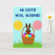 This card shows a friendly brown bunny 🐰 with wide, gentle eyes and a small red bow tie, peeking out of a woven basket as if it’s leaning in for a sweet hello. The basket is packed with decorated eggs in bright mixes of patterns, including magenta stripes, sunny yellow dots, and calm aqua bands, arranged like a shared treat between close friends. On either side, two oversized spiral candies curl upward—one golden yellow and the other soft pastel pink—framing the bunny like a cheerful pair standing close together. The background is a smooth sky-blue field that sets a light spring mood, while a strip of stylized green grass runs along the bottom like a simple meadow 🌷. Across the top, a curving greeting is placed prominently in deep cerulean blue, standing out clearly against the blue sky. The letters arc over the scene like a banner, guiding your eye down toward the bunny and its basket. The overall look uses flat areas of color and crisp outlines, with the pink and yellow candy swirls echoing the egg decorations. At the base, the green grass forms a neat band beneath the basket, with the eggs’ patterns and the two spiral candies balancing the composition.