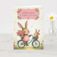 This card shows two rabbit-like friends riding together through a sunny spring scene, with a tender closeness in the way the smaller one leans forward to peek out 🐰. A larger brown-furred character with dark eyes and rosy cheeks pedals a teal bicycle, wearing a soft pink patterned pinafore while holding a bouquet of coral roses close to their chest. In the front wicker basket, a smaller companion with a little red bow sits snugly, looking up as if sharing a quiet, happy moment 🐇. The wheels roll along a winding golden path bordered by green grass and scattered red flowers, suggesting a gentle outdoor stroll. Behind them, the sky and fields blend into pale yellows and greens, dotted with small pink starburst shapes that add a light, celebratory touch. Near the top, the main text sits inside an ornate banner with curled edges, and extra roses decorate the sides of the frame. The banner is centered in the upper portion, with the lettering set neatly against the light background for easy reading. The teal bike frame, spoked wheels, and woven basket stand out against the soft pastel backdrop and the golden path below.