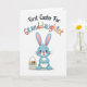 This card features a gentle digital illustration of an upright bunny in soft periwinkle blue, with pink inner ears, rosy cheeks, and a small smile that feels like it’s meant for someone close 🐰. Its paws are neatly clasped at the center, giving it a shy, affectionate posture, as if it’s posing for a loved one. To the bunny’s left sits a small, pale woven basket filled with brightly colored eggs in red, green, gold, and purple, some with light stripes for extra detail 🌷. Across the top, the words “First Easter For” appear in dark, flowing lettering, placed above the character with plenty of white space around it. Just below that, “Granddaughter” curves in an arc, with each letter in a different pastel shade like orange, green, blue, and red, each lightly outlined so it stands out. The background stays plain white, making the soft fur texture, shiny egg colors, and gentle facial expression easy to notice. The basket rests slightly forward of the bunny’s feet, and the eggs peek over the rim in a tidy cluster.
