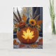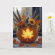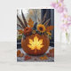 Design de folha de maple brilhando em uma abóbora de outono com penas faisão e flores de queda. O texto dentro pode ser alterado.