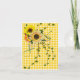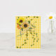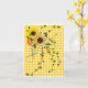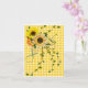 Buquê de girassol amarelo com mariquinhas e joias sobre fundo de colcha de gingham para um cartão de nota de vazio