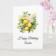 Cartão de aniversário com uma ilustração adorável de um buquê de limões rodeados de folhas de flores brancas e prigos.