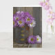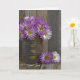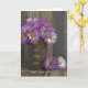 Buquê de outono roxo numa lata enferrujada de lata sobre madeira com penas. O texto pode ser alterado.