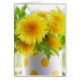 Um buquê alegre dos dentes-de-leão em um vaso amarelo do polkadot