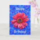 Minha trabalho de arte digital original, com minha fotografia original de uma flor vermelha de margarida Gerbera, é apresentada neste bonito cartão de aniversário floral. A imagem foi processada com efeito de fantasia de aquarela para uma aparência ilustrada e branca com margaridas azuis no fundo. A frente do cartão diz "Parabéns!" e a dentro do cartão diz "Esperança que este dia floresça com muita felicidade!". Um cartão de excelente para qualquer amante da natureza e da flor.