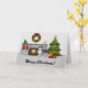 A ilustração original do desenho de Destei de um lindo Cachorro Azul Shetland Sheepdog / cão da raça Sheltie. Há também uma área de texto personalizável que diz agora "Feliz Natal!". O cachorro é colocado em uma sala festiva que tem uma lareira. A lareira está ligada e tem duas meias vermelhas penduradas ao seu lado. No topo da lareira há uma coroa verde que é decorada com um arco vermelho e alguns círculos amarelos como luzes. Por cima do manto há três pequenas árvores em forma de triângulo também decoradas com círculos amarelos como luzes. A manta também tem duas velas beges. Ao lado da lareira há uma árvore de Natal verde festiva com dois presentes debaixo dela. A árvore de Natal é decorada com ornamentos redondos vermelhos e amarelos e uma terra de cinzas. No topo da árvore há uma estrela amarela.