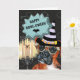 Uma design divertida e atraente de um cão-boxer vestindo um chapéu de bruxa preto e cinza listrado e óculos de osso de cão contra um fundo cheio de candelabros; e uma aranha assustadora escalando as velas. Uma bolha de fala com as palavras, Happy howl-over aparece no cobrir e o dentro tem um modelo para sua mensagem personalizada.