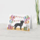A ilustração original de desenho animado de Destei de um cão da raça Labrador Retriever, de cor preta, entre alguns balões de aniversário de cor pastel, presentes e um banner de bunting. As cores pastel incluem rosa, verde, azul, vermelho, laranja e roxo. O cachorro está parado sobre uma textura amarela de chão de madeira e o fundo tem um padrão de bolinhas pastel lúcido. No dentro da placa, há também uma área de texto personalizável para uma mensagem personalizada.