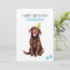 Feliz aniversário com um nome personalizado. Uma ilustração fofa de cachorro Labrador de Chocolate com chapéu de aniversário e balões. Adicione sua própria mensagem para um cartão exclusivo pessoal. Arte feita com aquarelas.