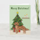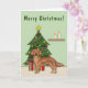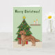 Deseje Feliz Natal aos seus amigos e família com a ajuda deste festivo design do tema cão que mostra a ilustração original de Destei de um lindo cão da raça Retriever Ouro de cor vermelha. O cachorro está parado por uma árvore festiva de Natal decorada com ornamentos vermelhos e amarelos, uma pérola branca e uma estrela amarela que é colocada no topo da árvore. Há também dois presentes embrulhados pela árvore. A cor do chão é bege e a cor da parede de fundo é verde-claro. Há também uma área de texto personalizável que agora diz: "Feliz Natal!".