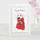 Saudação de Natal fofa com um cão Golden Doodle branco vestido para as festas com capa de seda vermelha e segurando Poinsettias vermelhas.