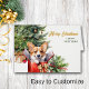 Neste cartão de Férias, um pop de cachorro Corgi fofo, de uma caixa de presentes de Natal vermelha. Atrás dele está uma árvore decorada de Natal. O texto dourado à direita diz "MERRY CHRISTMAS", com FELIZ ANO NOVO em verde abaixo. Todo o texto, dentro e fora, pode ser facilmente mudado para qualquer coisa que você quiser. Podem ver mais imagens e produtos de cães na Dog Village.