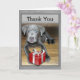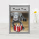 Aqui está um cartão de agradecimento com um adorável filhote de Labrabull prateado que vai tocar seu coração. O design é uma foto do meu cachorro, com sobreposições de um presente embrulhado em vermelho e uma moldura de madeira cinza. Personalize este cartão de agradecimento com seu próprio cumprimento ou compre como mostrado com texto de agradecimento.