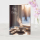 Uma xícara de café a vapor numa mesa de pau e madeira pela janela de inverno para o aniversário. Todo texto é editável.