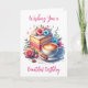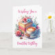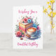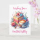 Um pedaço bonito de bolo com estilo ai aquarela, com flores rosa e azuis, ao lado de uma xícara de café ou de um cartão de aniversário floral bonito.