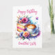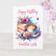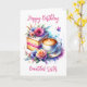 Um pedaço bonito de bolo com estilo aquarela ai com flores rosa e roxas ao lado de uma xícara de café ou cartão de aniversário floral bonito.