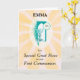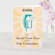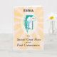Parabéns à sua sobrinha-neta especial enquanto ela faz sua Primeira Comunhão. Este cartão celebra com um brilho de sol dourado com um cálice, hóstia e trigo no centro em cor azul-turquesa. Personalize com o nome dela para um presente verdadeiramente pessoal neste dia santo.
