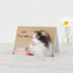 Long haired calico kitty cat with cake icing on her face and a bite out of the birthday cake cute and funny cat lovers birthday greeting card