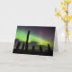 A card with a photo of the Callanish Standing stones on the Isle of Lewis, Scotland. Showing a vivid strip of active green Aurora Borealis/Northern lights, with lighter green and purple columns.