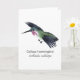 Uma ilustração de um beija-flor-clã feita com lápis colorido. Os nomes comum e latino estão representados abaixo da ave.