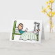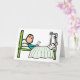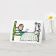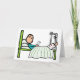 O design da cama de hospital mostra um boneco de palito lendo um cartão enquanto está deitado na cama. Tem uma perna quebrada em um gesso assinado levantada por equipamento especial. O paciente tem travesseiros confortáveis e uma atitude resignada relaxada em relação à estadia no hospital. Se recupere logo!