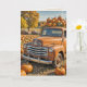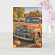Um caminhão de colheita carregado com abóboras está estacionado em um campo de abóbora de outono. O texto pode ser alterado.